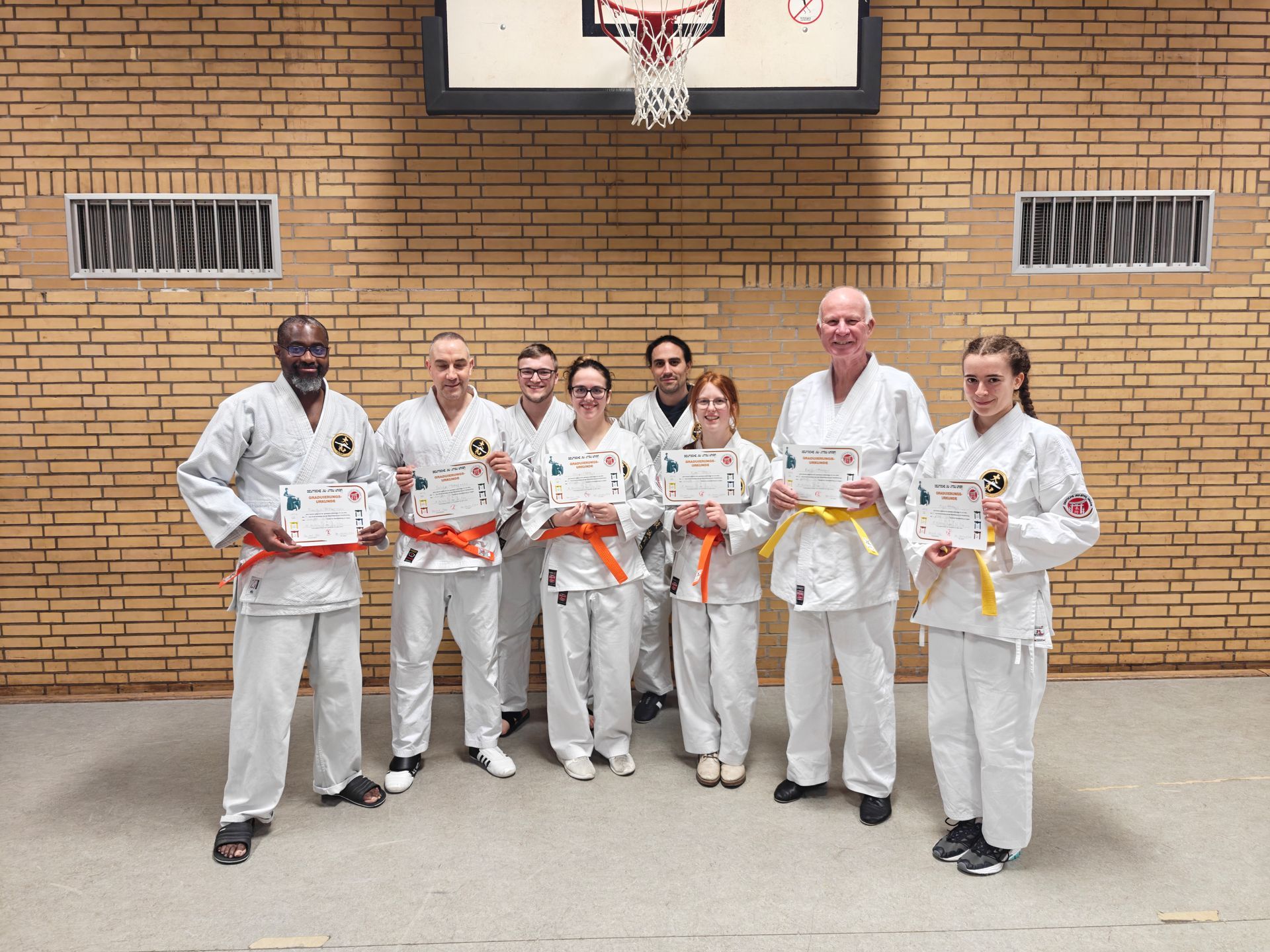 Wir gratulieren an dieser Stelle Sascha Weckmann, Franck Akomezogho, Kira Vettin und Nora Vettin (alle Orange-Gurt). Rolf Mertens, Mia Hertrich Milo Barekzai, Yuna Barekzai, Jon Henn und Marcel Ruppert (alle Gelb-Gurt). Maximilian Ruppert, David Dascalu, Nico Wahrheit, Adrian Erfurt, Julian Erfurt und Marlon Schneider (alle Weiß-Gelb-Gurt).